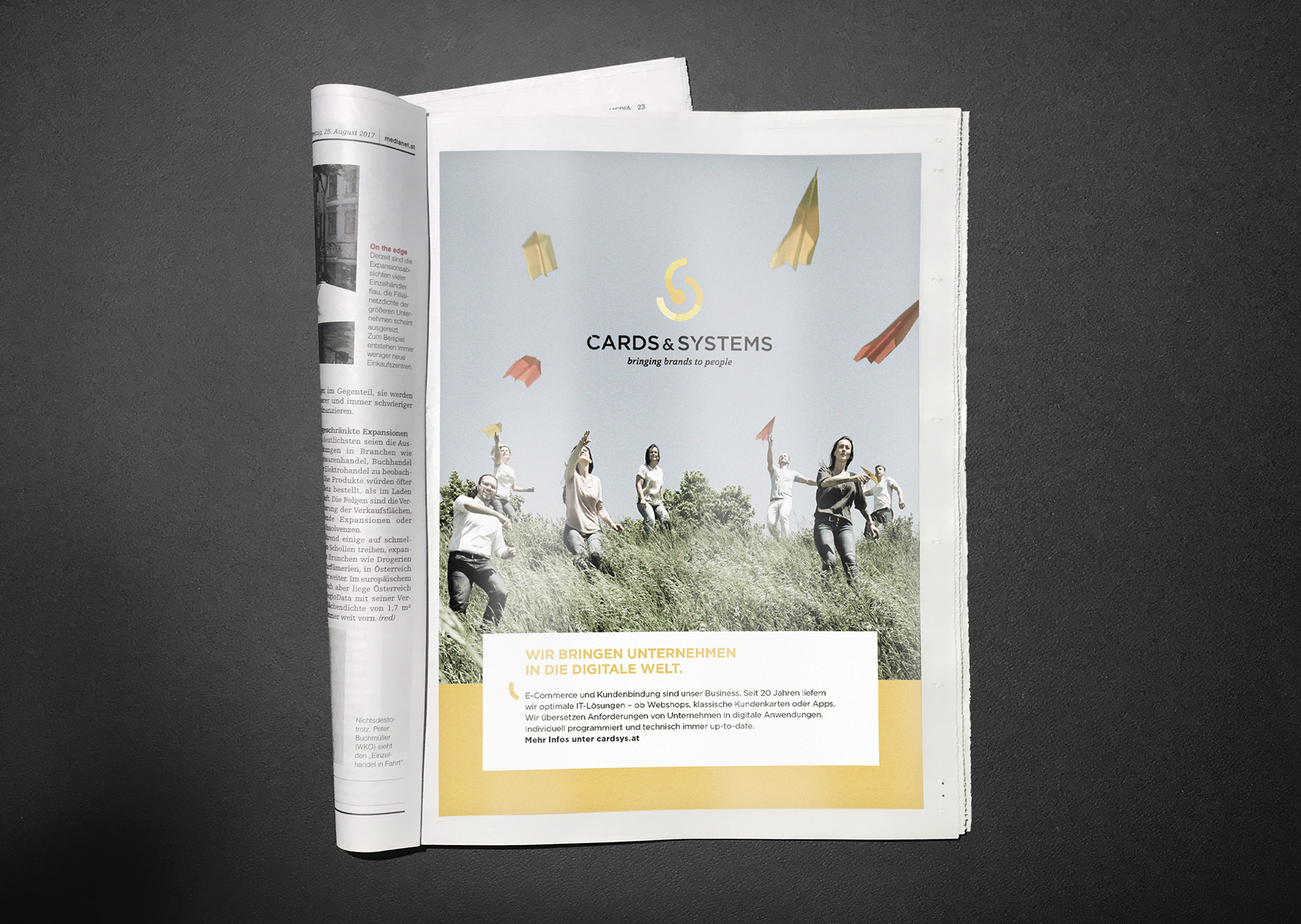 Das IT-Unternehmen Cards & Systems ist seit 20 Jahren erfolgreich am Markt. Die Kernkompetenzen haben sich weiterentwickelt, neue Tätigkeitsfelder sind hinzugekommen. Damit war es an der Zeit, dies in einem neuen Logo sowie auch im Gesamtauftritt spürbar und sichtbar zu machen. Der neu entwickelte Claim "bringing brands to people" ist Kern der Kommunikation und bringt das breitgefächerte Leistungsspektrum auf einen Nenner.