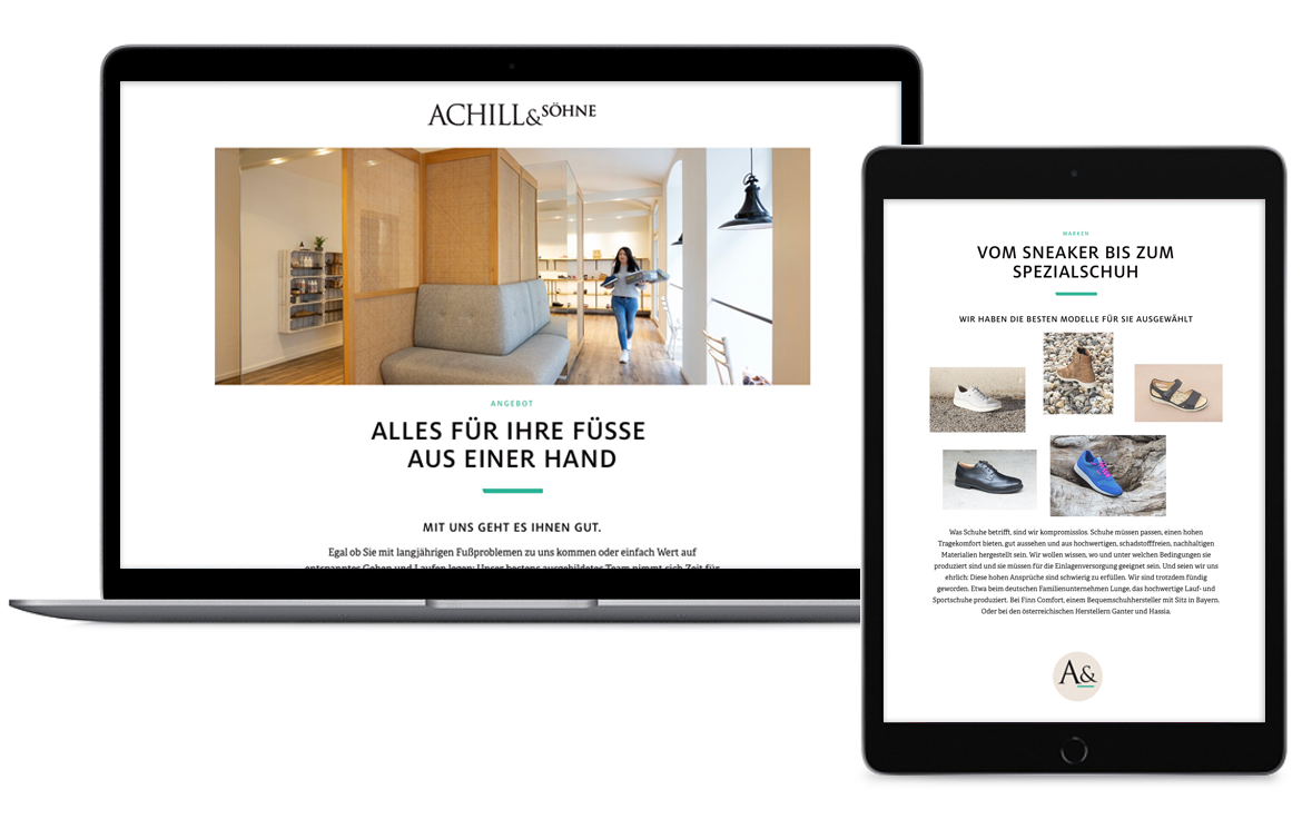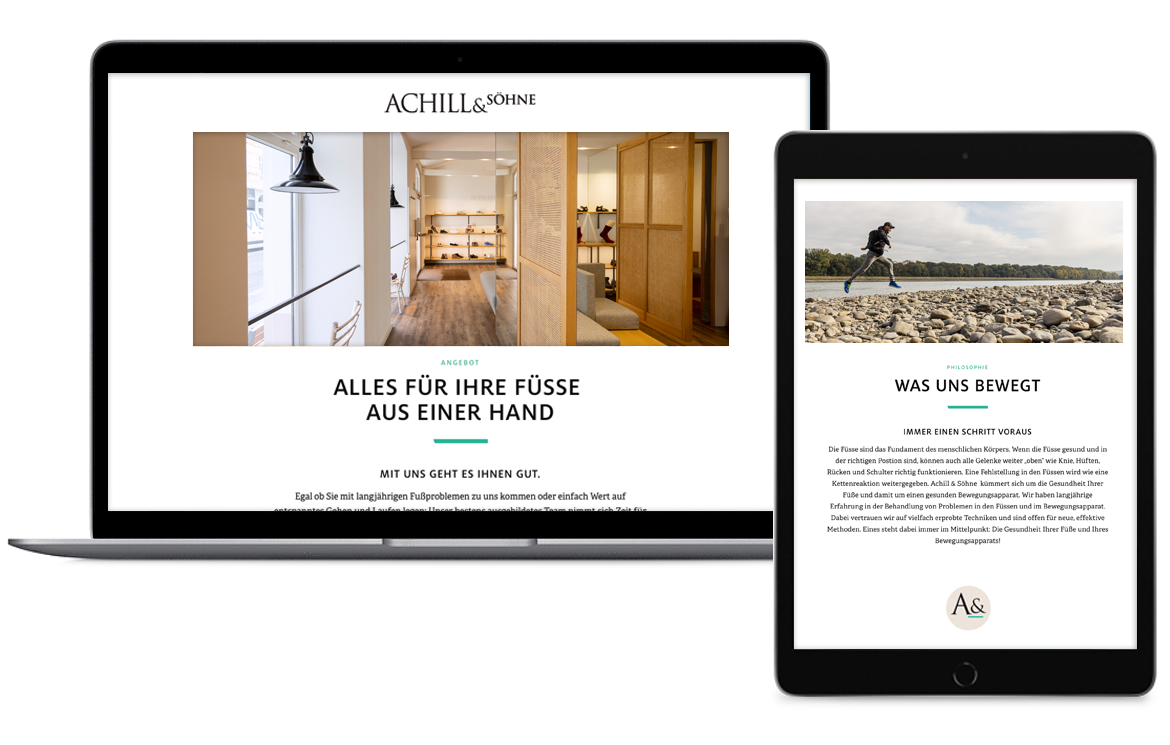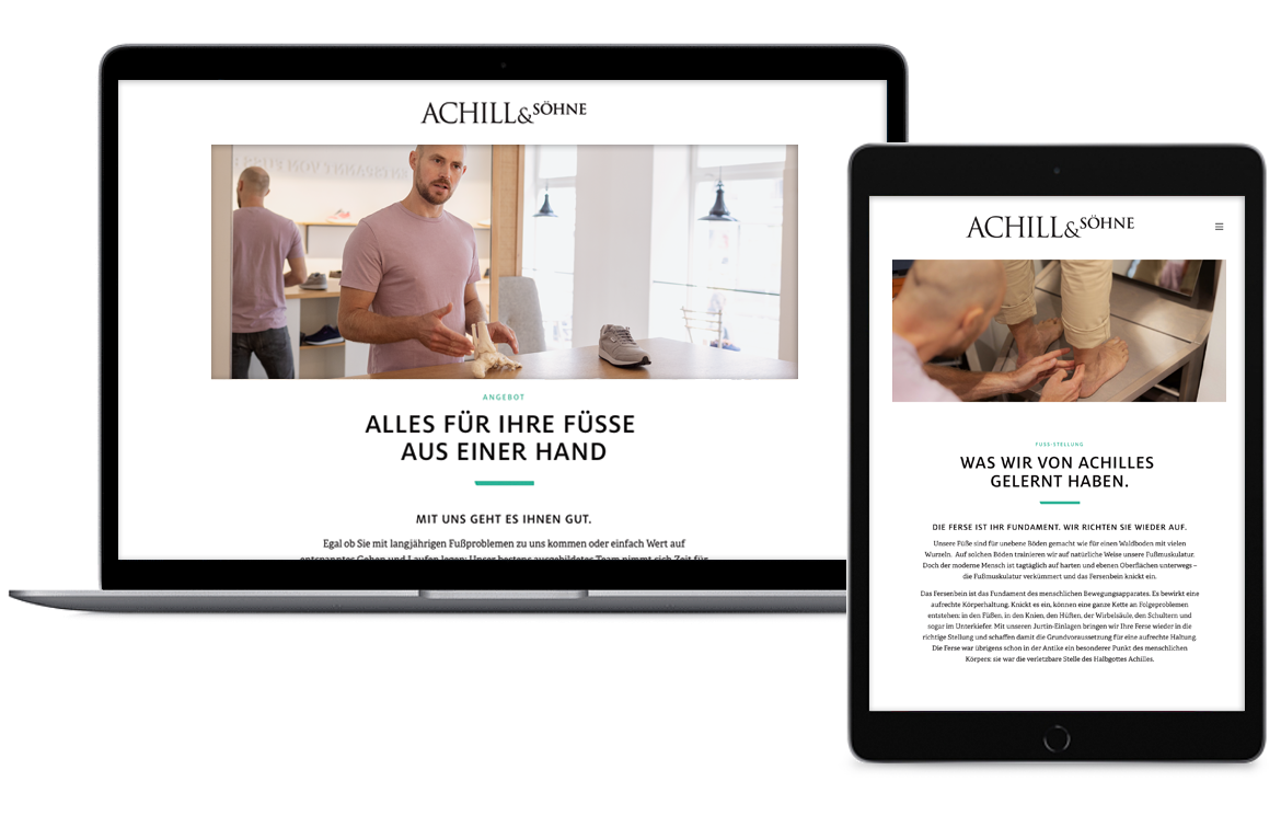 Achill und Söhne ist führender Experte rund um die Fussgesundheit mit Standort Wien. Seit Beginn begleiten wir die Gründer Clemens Haslinger und Helmut Riegler in Sachen Strategie, Marke und Kommunikation. Von der Tragtasche über Webauftritt bis hin zu Produktentwicklung. Nach Jahren des kontinuierlichen Wachstums wurde die Marke um ein prägnantes Akronym-Logo ergänzt – und einem Claim, der das breite Angebot auf den Punkt bringt. Ab jetzt gibt es A&_ auch mitten in Linz, wo wir das aktuelle Branding und Shopdesign gleich sichtbar machen konnten.